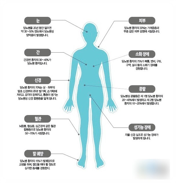 또한 뇌, 심장, 하지에 혈액을 공급하는 혈관에도 문제가 생길 수 있고, 작은 혈관의 합병증으로 이어질 경우 눈, 신장, 신경에도 문제를 줄 수 있습니다.