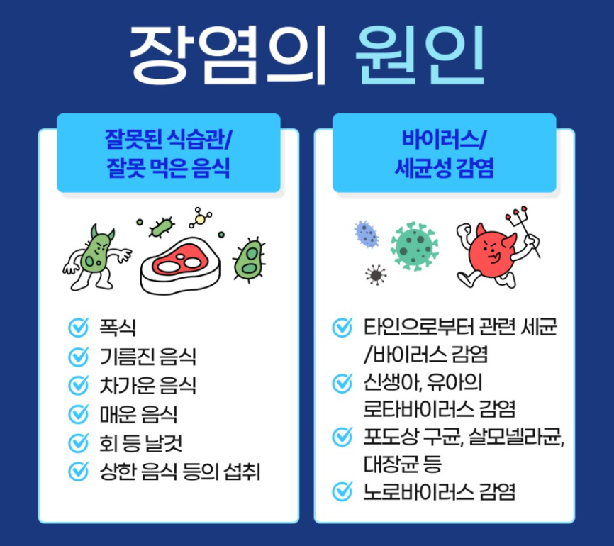 장염은 대장이나 소장의 염증을 의미하여, 이는 바이러스, 박테리아, 기생충, 알레르기 반응, 특정 약물의 부작용 등 다양한 요인에 의해 발생할 수 있습니다.