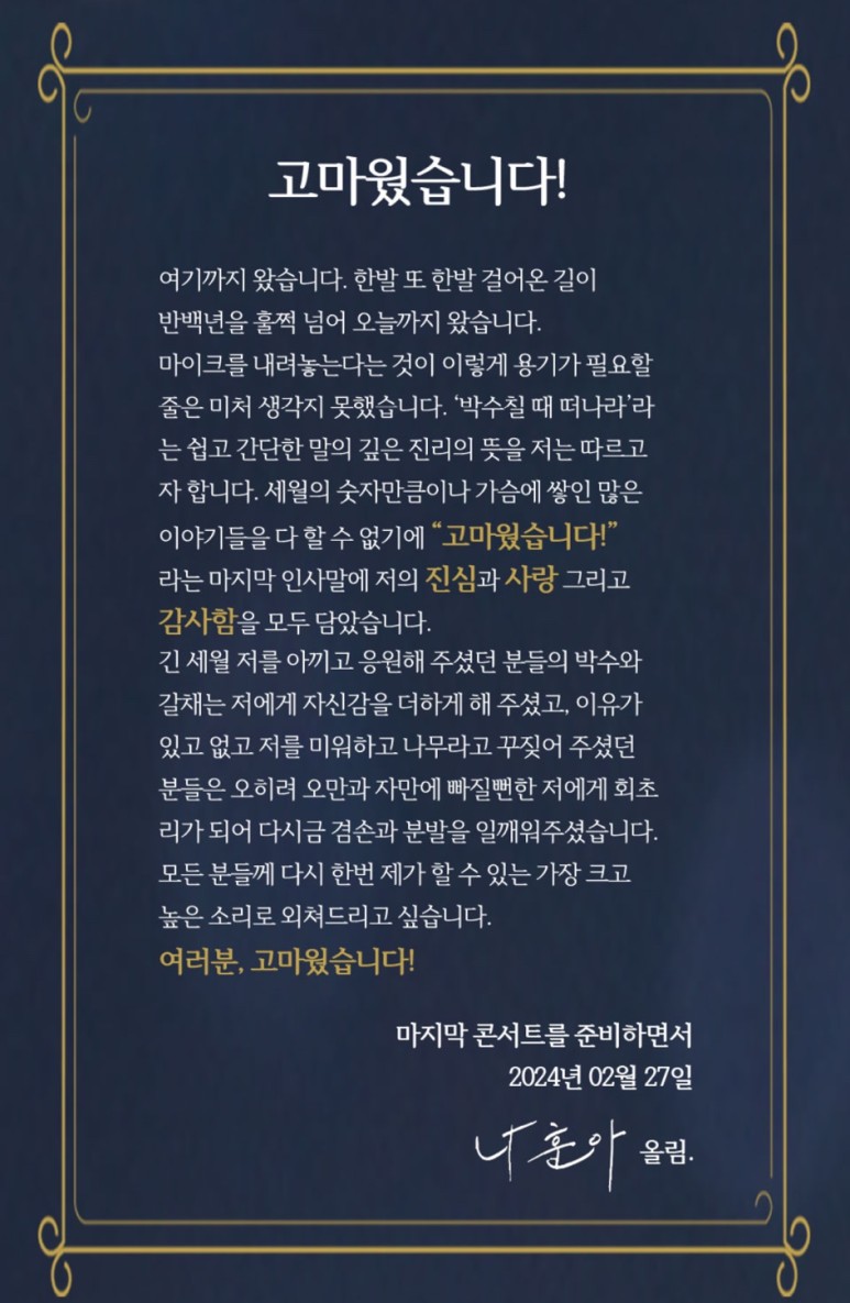 나훈아 선생님께서 작성하신 편지의 내용입니다. 반백년을 훌쩍 넘어 기나긴 여정을 하신 모습에 감동과 존경심이 공존합니다. 많은 사람들에게 희망의 음악을 해주셔서 감사합니다.